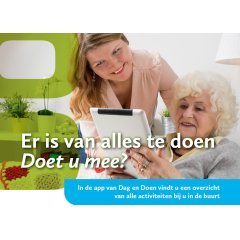 Dag en doen biedt oplossing! Via een gebruiksvriendelijke app die gratis te downloaden is via tablet, smartphone of de computer, is een digitale agenda te vinden van activiteiten die in eigen omgeving plaatsvinden. Ouderen kunnen zich via de app aanmelden en vervolgens activiteiten uitkiezen om naartoe te gaan. Vrijwilligers leren ouderen hoe Dag!enDoen! werkt en helpen zo lang dat nodig is. Er is digitale hulp, de optie voor vervoer wanneer nodig en zij kunnen evt. mee naar een activiteit.
